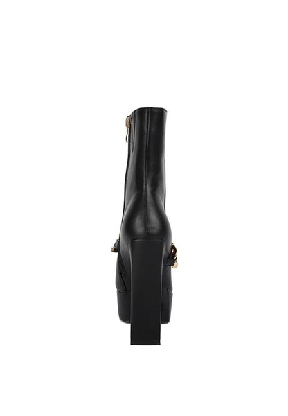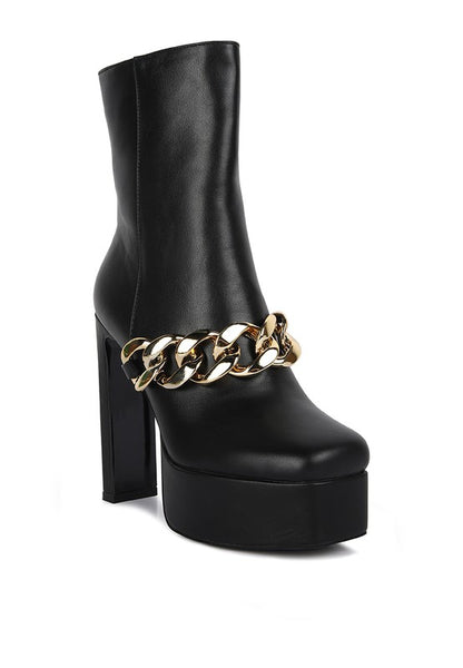 High Block heeled square toe boots with chunky metal chain deets look all gorg! The high platform adds to the height. Has a side zipper for closure.