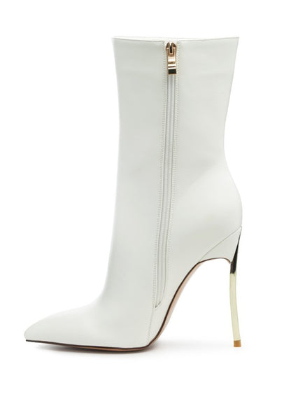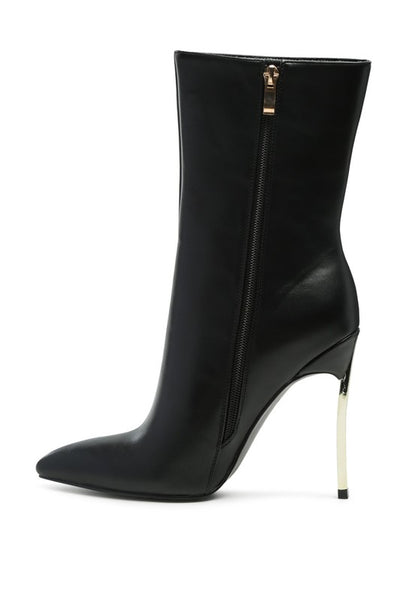 Pointed Toe high heel boot with metallic stiletto heel grabs attention for right reasons. This stylish ankle boot comes with side zipper opening.