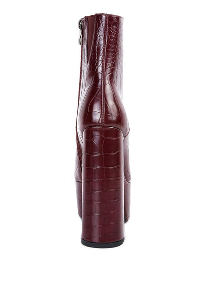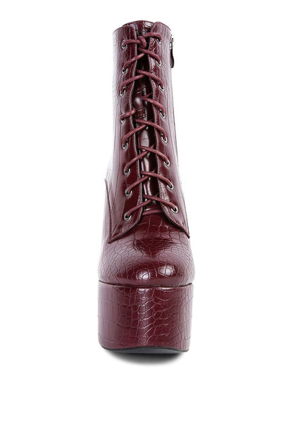 Croc Textured High Block Heeled Boot the stylish pointed toe boot looks gorgeous on the feet. The stylish biker ankle boot has raised platform with lace up detail and comes with an easy to wear side zipper opening.