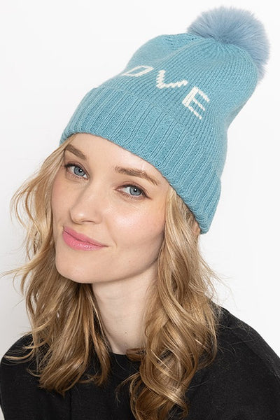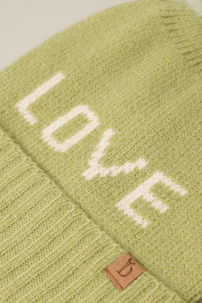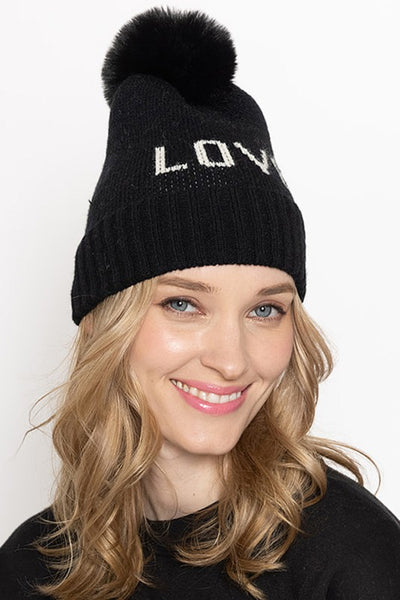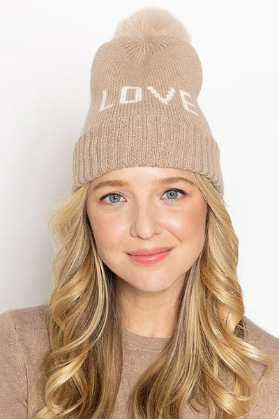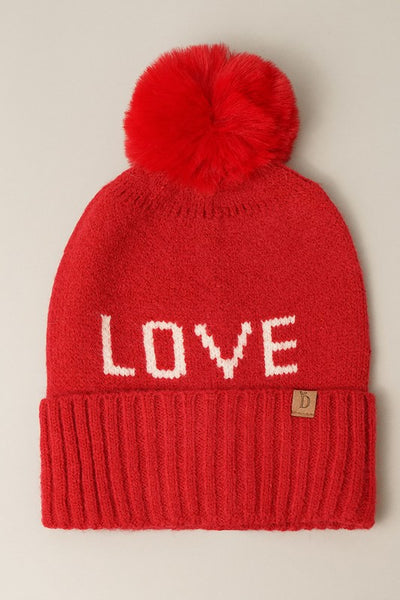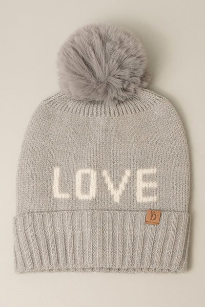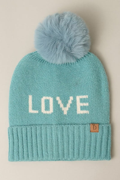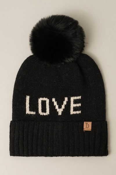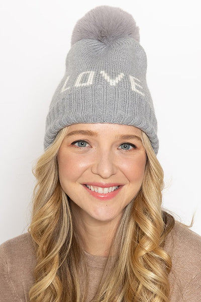 LOVE Ribbed Cuff Knit Beanie Hat w Pom Pom