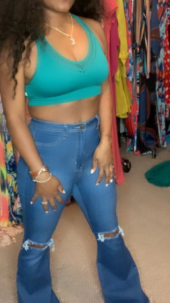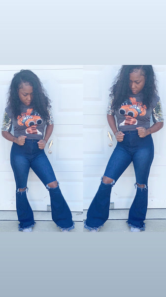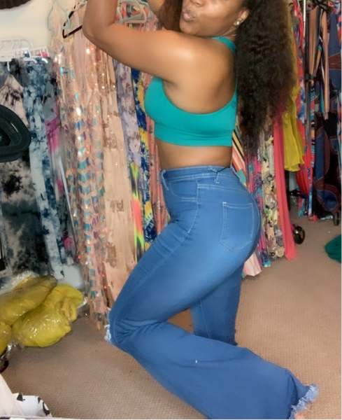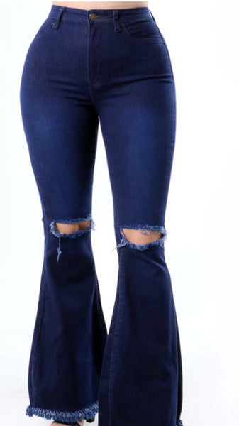 Dark High waist distress knee bell bottom denim fray raw hem ankle jeans. Fits true to size